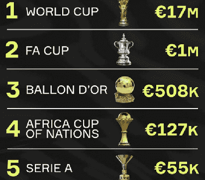 而世界杯之后是英格兰足总杯的奖杯,足总杯奖杯的造价是100万欧元,他的制作材料是银的,这是一个纯银打造的奖杯。第三的是金球奖的奖杯,他的造价是50.8万欧元,金球奖是用黄铜制作的,但是表面是镀金的,而且金球奖是两个半圆球形组合在一起的,中间是用大量的银丝连接的,这也让金球奖造价不菲,金球奖总重12公斤(连底座)。第四的是非洲杯的奖杯,造价是12.7万欧元。第五是意甲奖杯,造价是5.5万欧元。